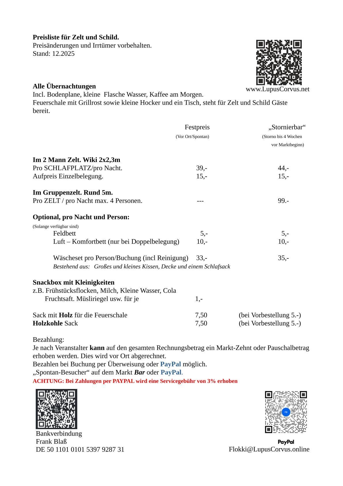 Incl. Bodenplane, kleine Flasche Wasser, Kaffee am Morgen.